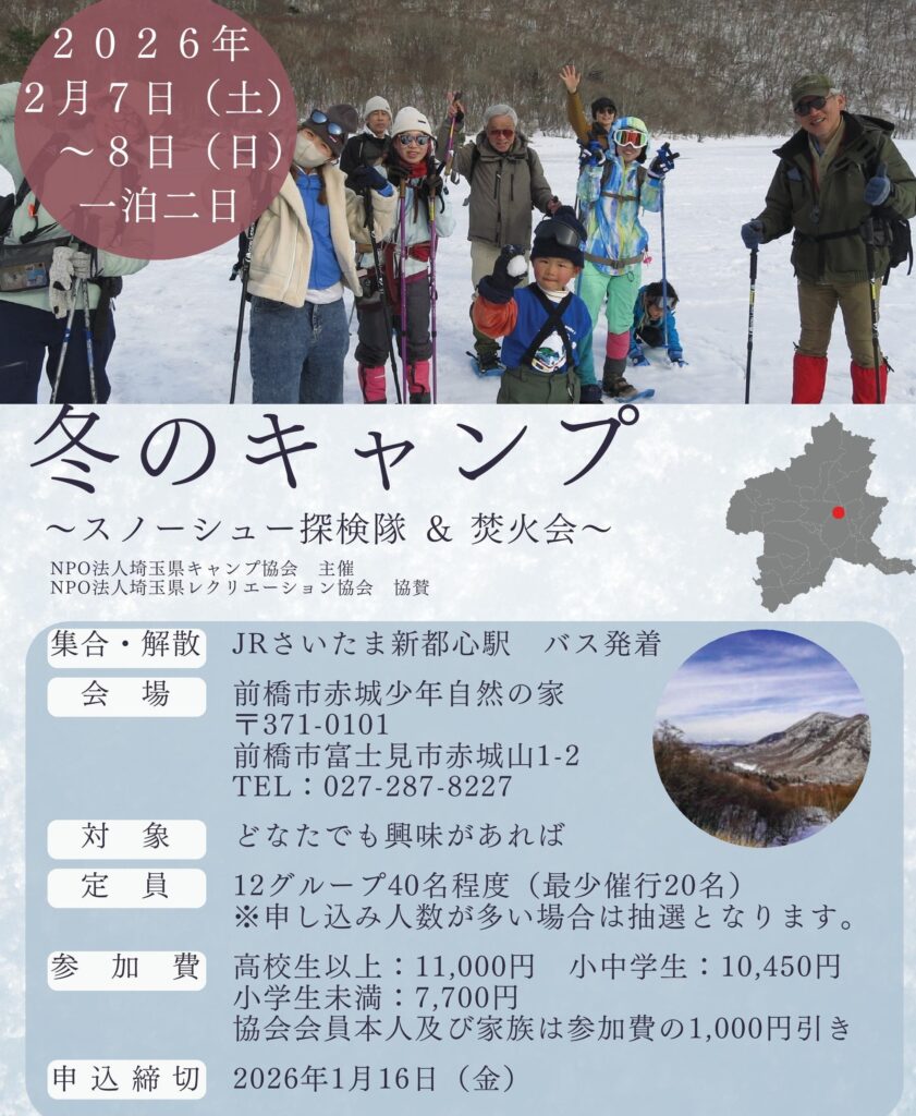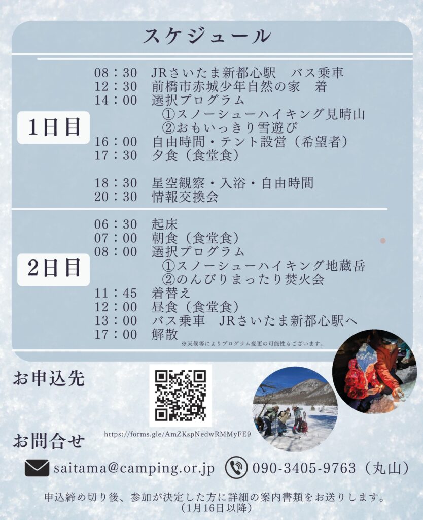 冬には冬の、冬にしかできないキャンプがある。雪のキャンプも、そのひとつ。埼玉を離れた群馬県の赤城山、たっぷりの雪の中で冬ならではのキャンプを楽しみます。雪道ドライブが不安な人でも参加できるよう、さいたま新都心駅近くから貸切バスで往復します。