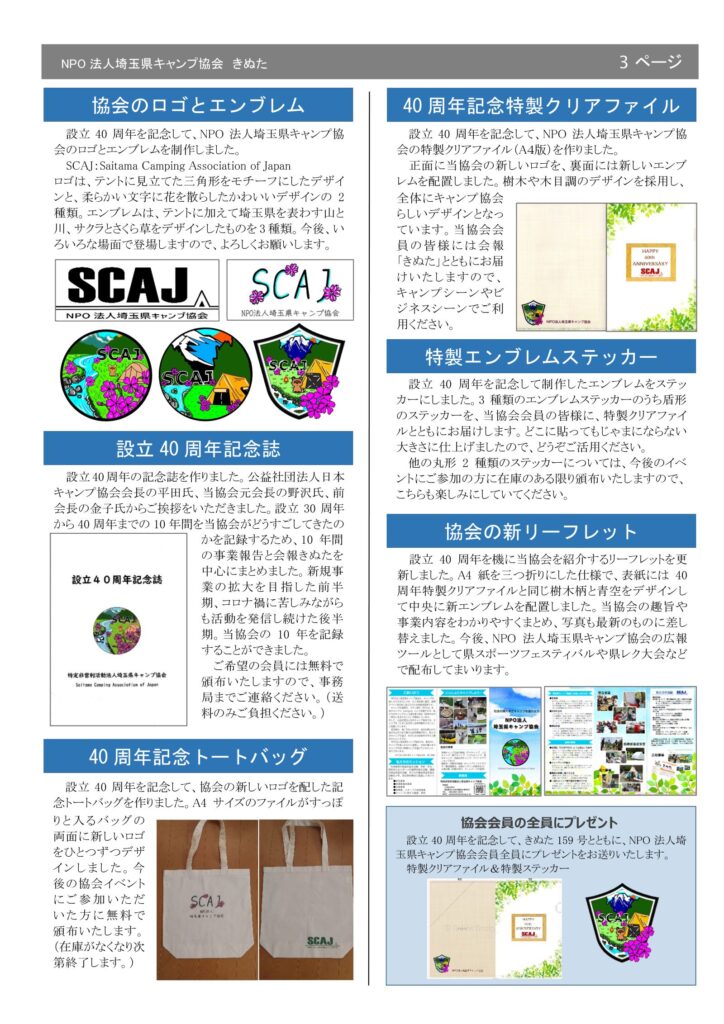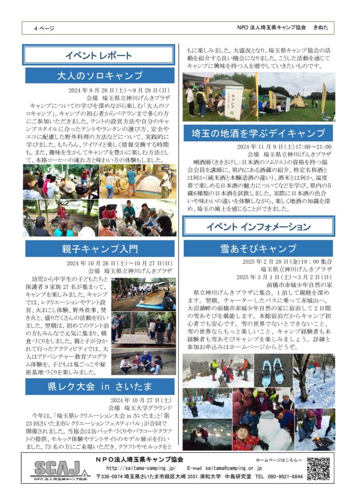 2025.02.10 きぬた159号(2024年-04号) 発行日 令和7年1月15日 きぬた 設立40周年を祝って 「交流のデイキャンプ」「祝賀会」 「語らいのキャンプファイアー」「モーニングイベント」 設立40周年を祝って 「協会新ロゴーマーク」「40周年記念誌」 「記念品」「協会紹介リーフレット」 イベントレポート 「大人のソロキャンプ」「親子キャンプ入門」 「県レク大会 in さいたま」「埼玉の地酒を学ぶデイキャンプ」 イベントインフォメーション 「雪あそびキャンプ」 Tweet Share Hatena Pocket RSS feedly Pin it この記事のタイトルとURLをコピーする 「冬のキャンプ」の開催について 前の記事 赤城山で冬のキャンプを実施しました。 次の記事